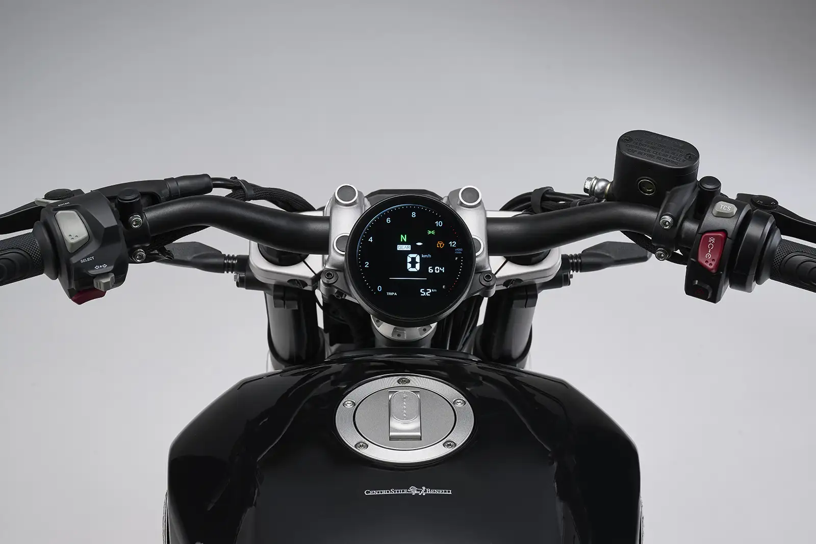 Le poste de pilotage reçoit un écran TFT circulaire, au graphisme épuré, regroupant l’ensemble des informations essentielles. Les rétroviseurs en bout de guidon renforcent l’identité visuelle du modèle et s’inscrivent dans la tendance actuelle du segment custom moderne.