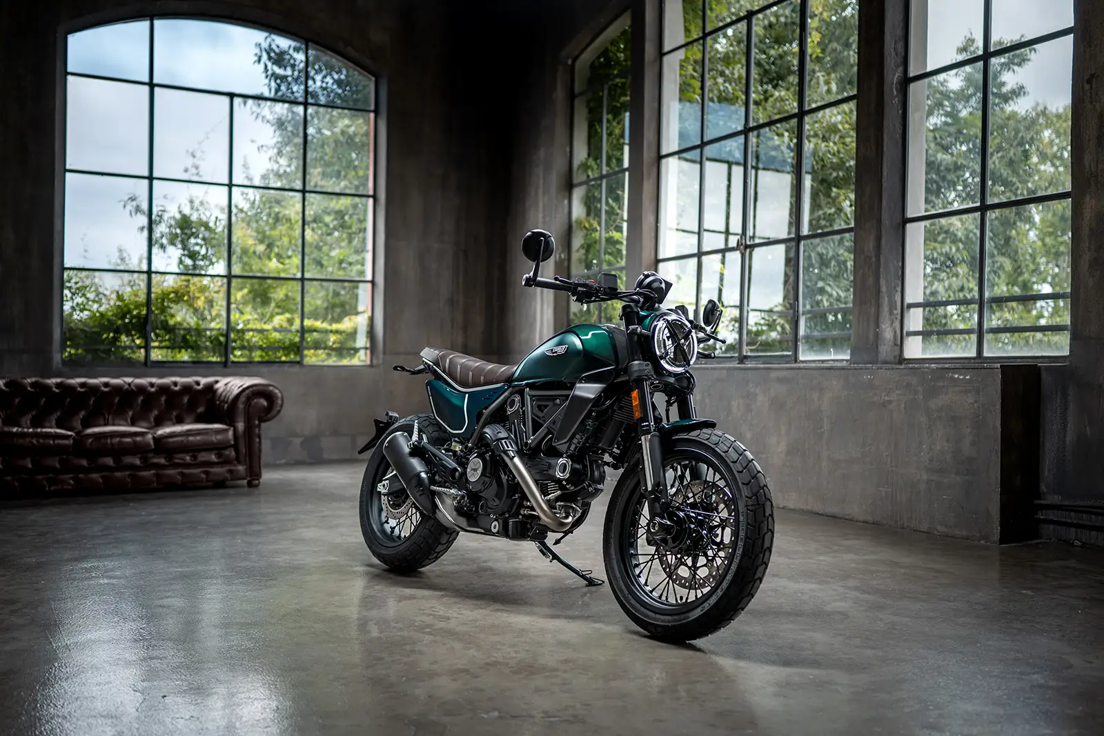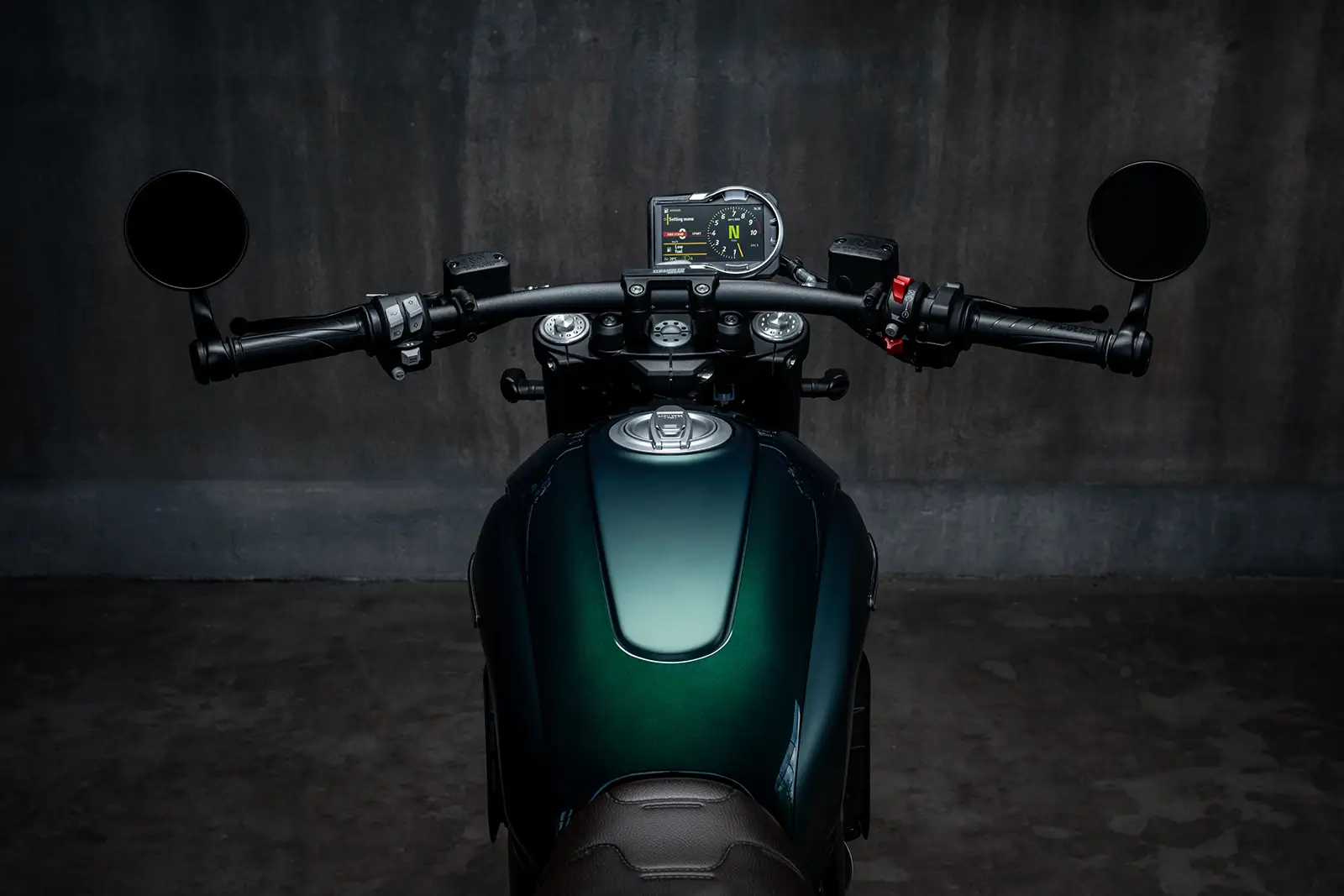La nouvelle couleur de la Ducati Scrambler Nightshift 2026 vert émeraude s’inspire directement des icônes à deux et quatre roues du sport automobile des années 1970. Ce choix lui donne un style rétro assumé, tout en restant moderne et élégant.