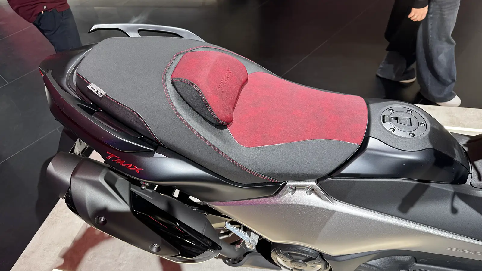 Le TMAX 25e Anniversaire se distingue par son carénage gris foncé métallisé mat, ses boomerangs gris clair, et ses écussons 3D chromés rouges. Sa selle rouge marquée à chaud incarne l’esprit premium de cette série limitée. Des jantes usinées noires et un cache moteur anodisé clair viennent parfaire ce design sportif.