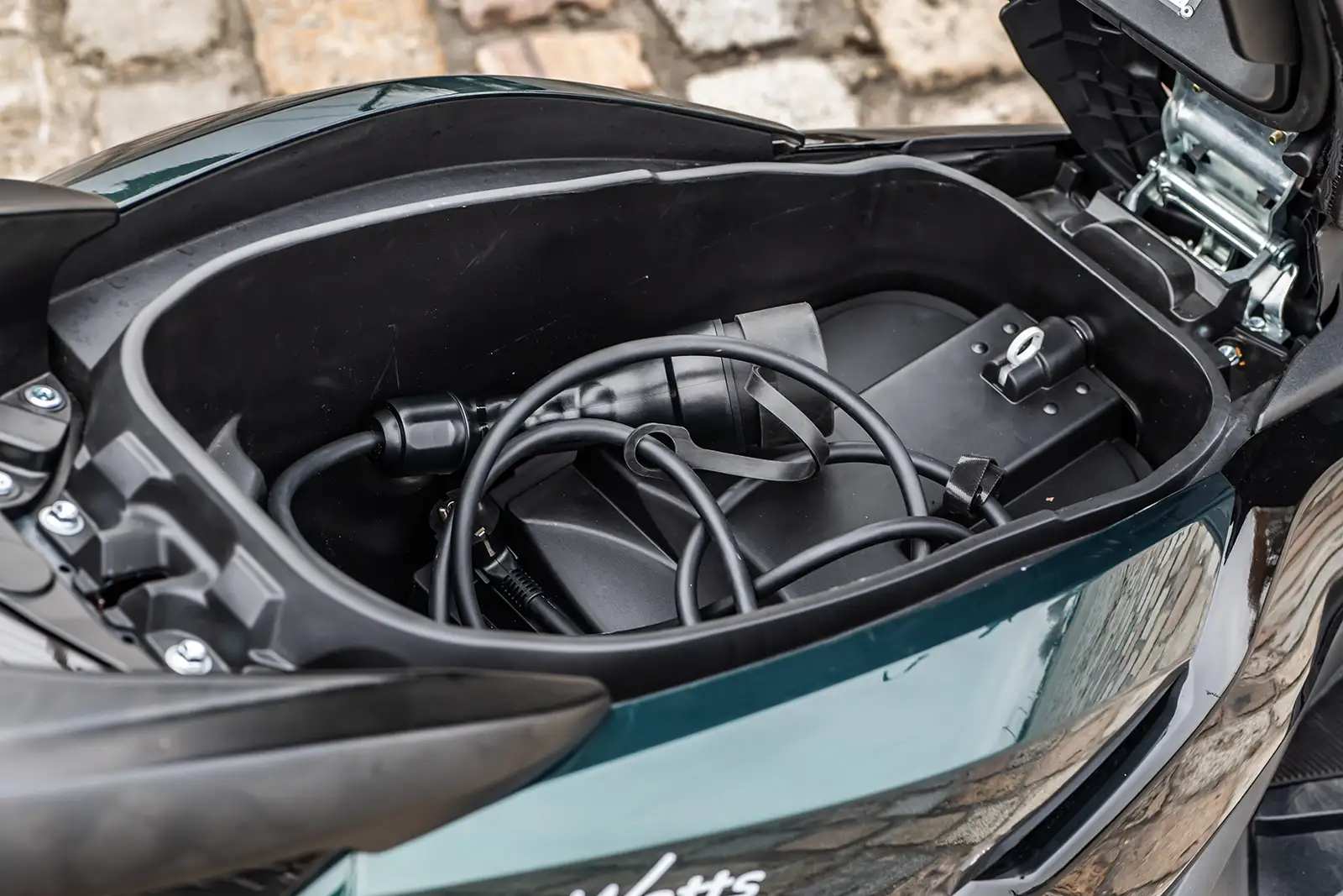 Niveau sécurité, le e-Spark embarque un traction control déconnectable, un ABS à double disques avant arrière et une alarme de série qui bloque les roues lorsque le scooter n’est pas sous tension. À l’avant, nous remarquons un emplacement factice pour une caméra…peut-être un indice pour une prochaine génération. En termes de capacité d’emport, le coffre du easy-Watts e-Spark loge la prise chargeur type 2 et accepte difficilement un petit casque jet sans visière et de petite taille.