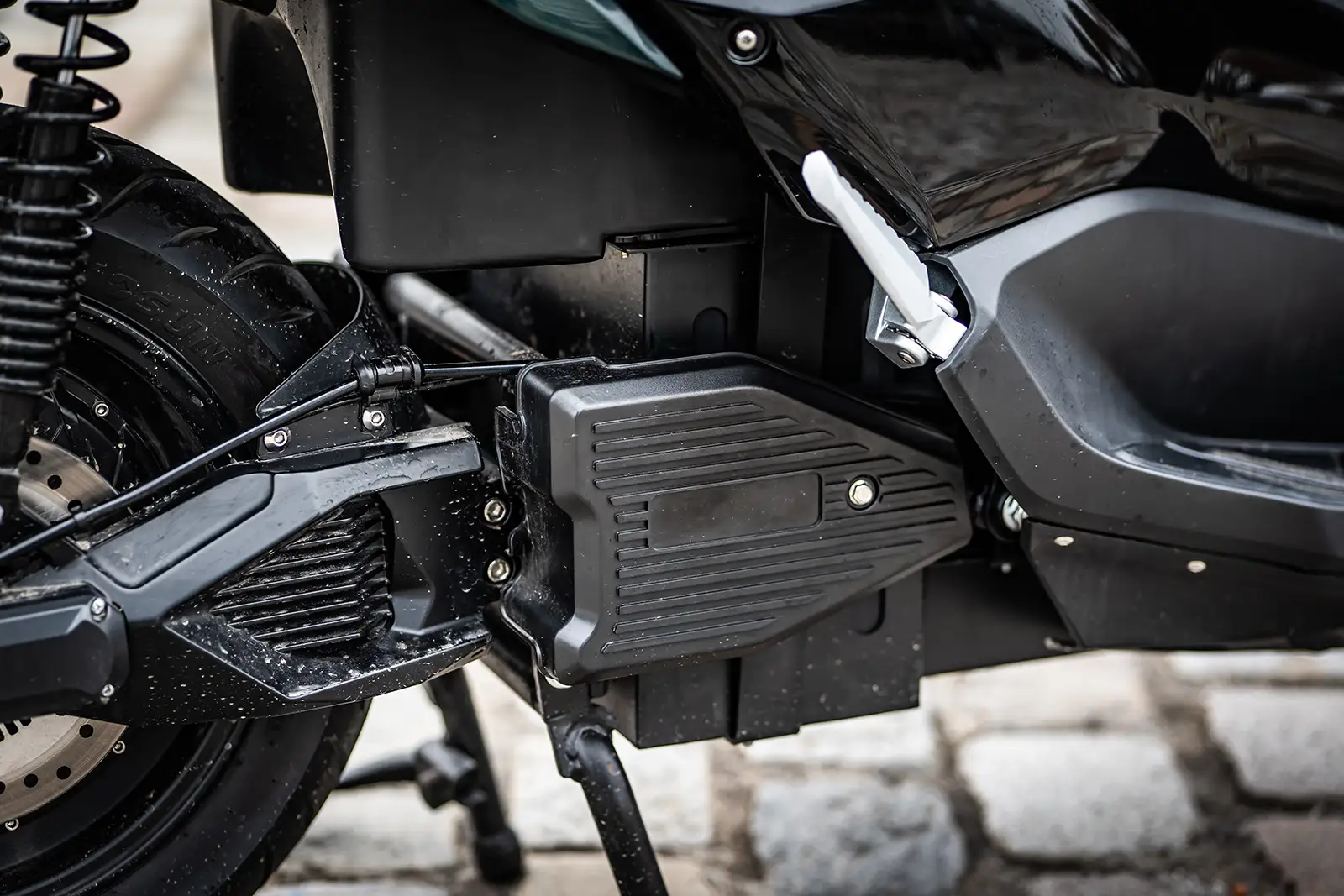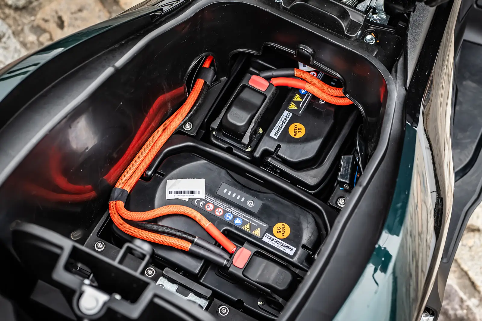 Au chapitre motorisation, le easy-Watts e-Spark intègre un moteur de 6 kW dans sa roue arrière. La puissance en pic est annoncée à 8,8 kW en pic par le constructeur. Pour alimenter l’ensemble, nous retrouvons deux batteries amovibles lithium-ion de 3,3 kWh chacune. Pesant 18 kilos à l’unité, elles se rechargent directement sur le scooter ou à domicile via un chargeur externe compact. Comptez 3 heures (interne ou externe) pour 80 % de charge ou 4,5 heures en interne et 5 heures en externe pour 100 % de charge. Trois modes de conduite sont proposés selon votre usage et vos besoins.
