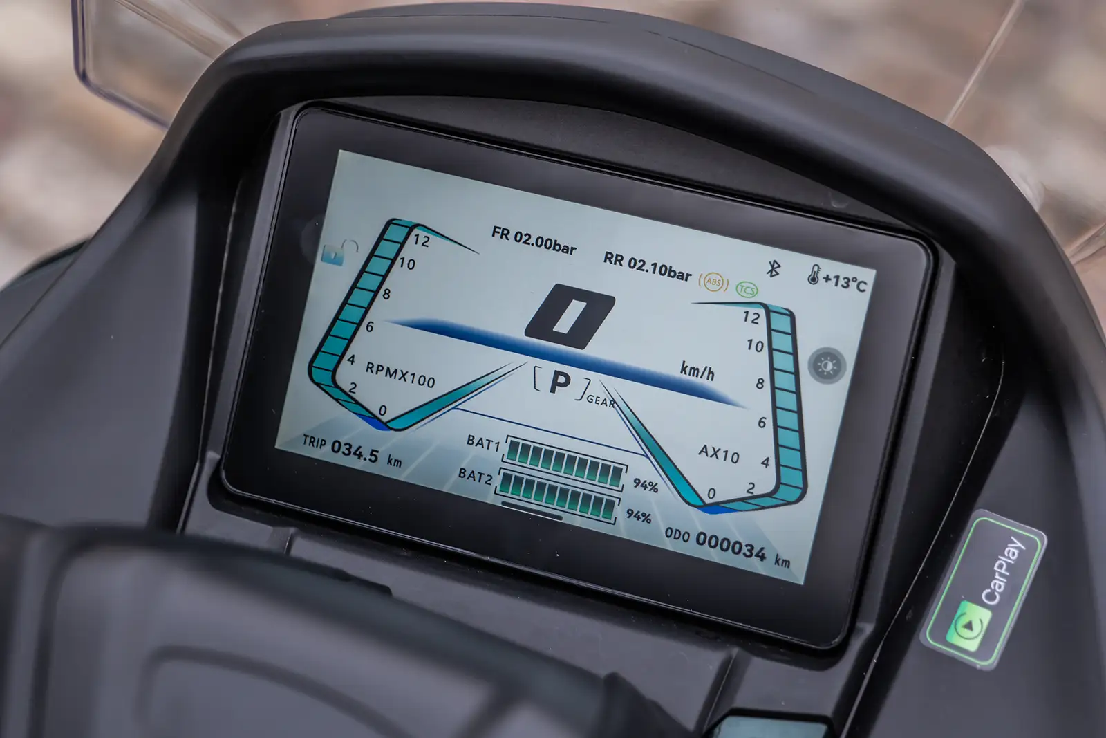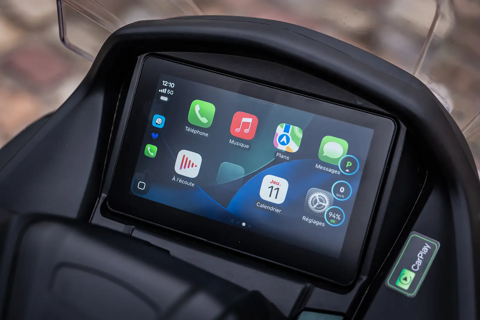 Autre point fort de ce scooter, le tableau de bord tactile TFT lisible et ultra complet intégrant Apple CarPlay et Android Auto sans fil. Un équipement de série qui change tout pour avoir accès en un instant aux applications du téléphone ou à Waze qui, à notre avis, est le plus pratique. Une fois testé, on ne comprend pas pourquoi les marques de deux-roues n’implémentent pas ce système systématiquement sur leur modèle !
