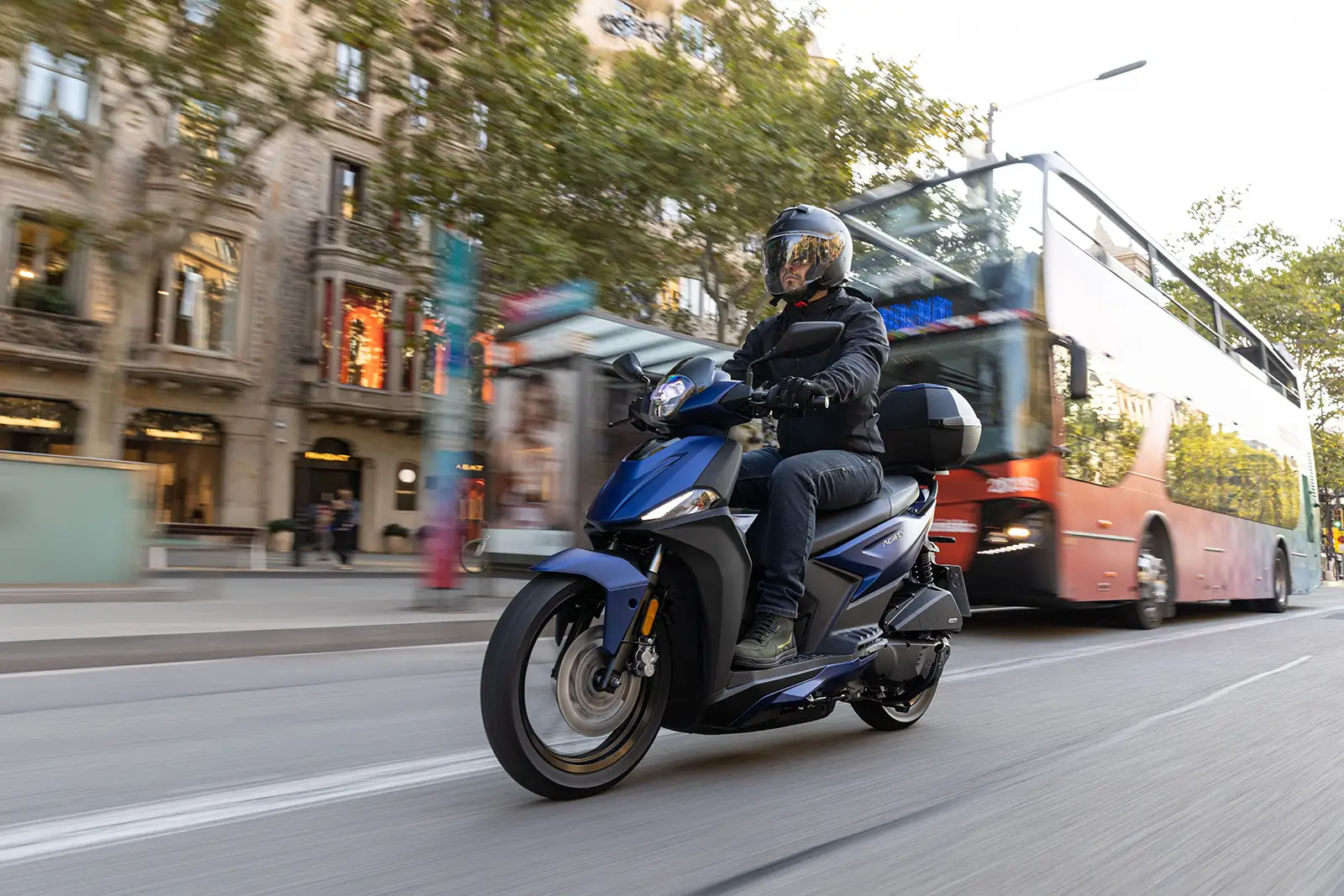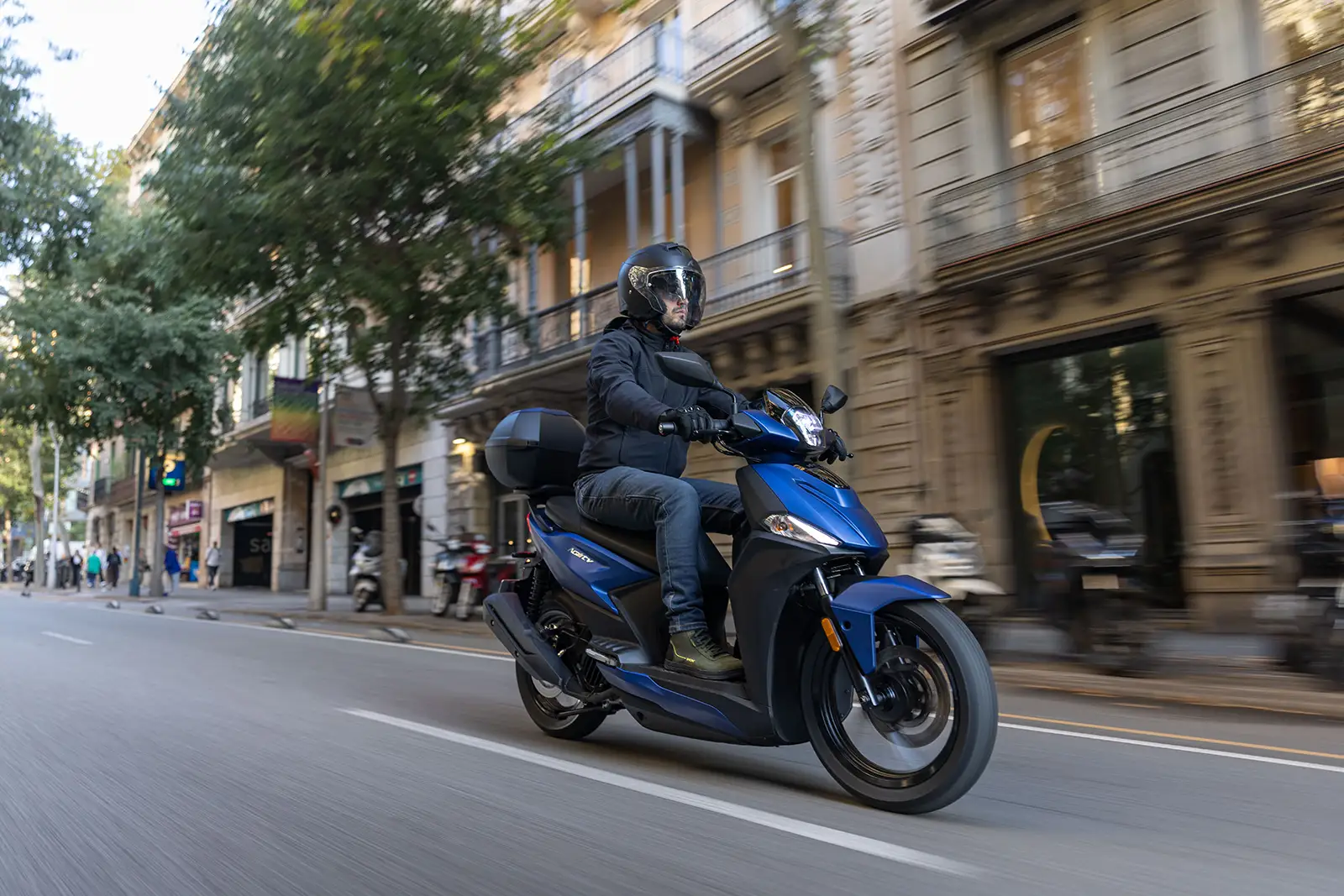 La praticité est assurée par un repose-pieds plat, un crochet pour sac rétractable, un porte-bagages arrière intégré, un espace de rangement sous la selle pouvant accueillir un casque intégral. L’équipement comprend également un top case de couleur assortie.