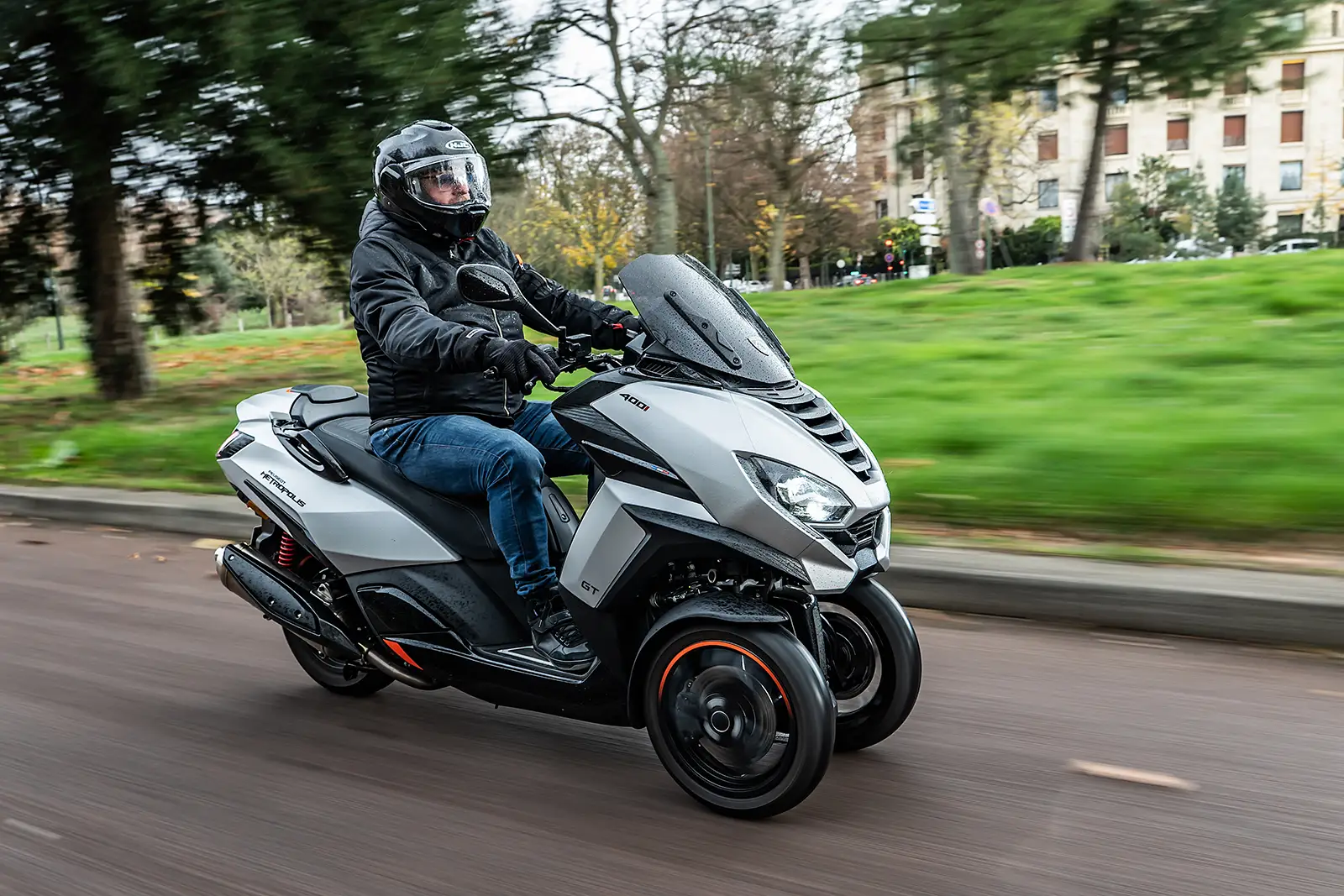 Apparu en 2013, le Peugeot Metropolis a connu un restylage en profondeur en 2020, mais n’a pas évolué depuis. Présenté au salon de Milan en 2017, le Kymco CV3 est lancé 5 ans plus tard par la firme taïwanaise. En 2026, il gagnera 24 cc, adoptera un blocage du train avant type « Roll Lock », un écran TFT 7 pouces et une béquille latérale.