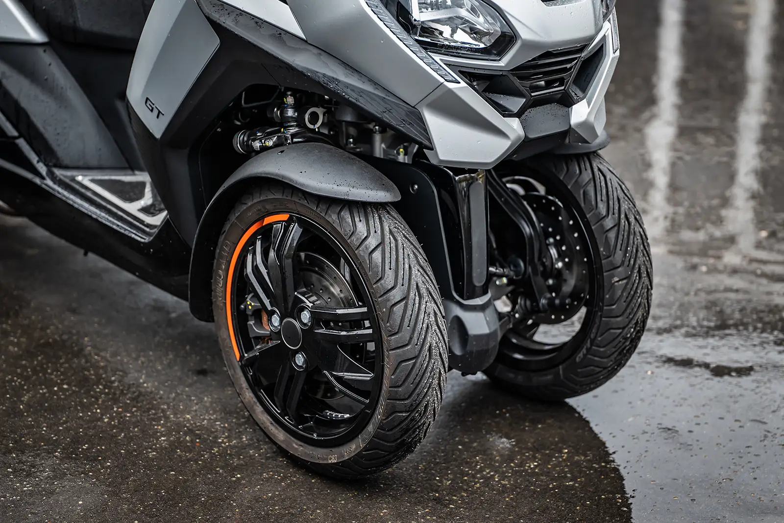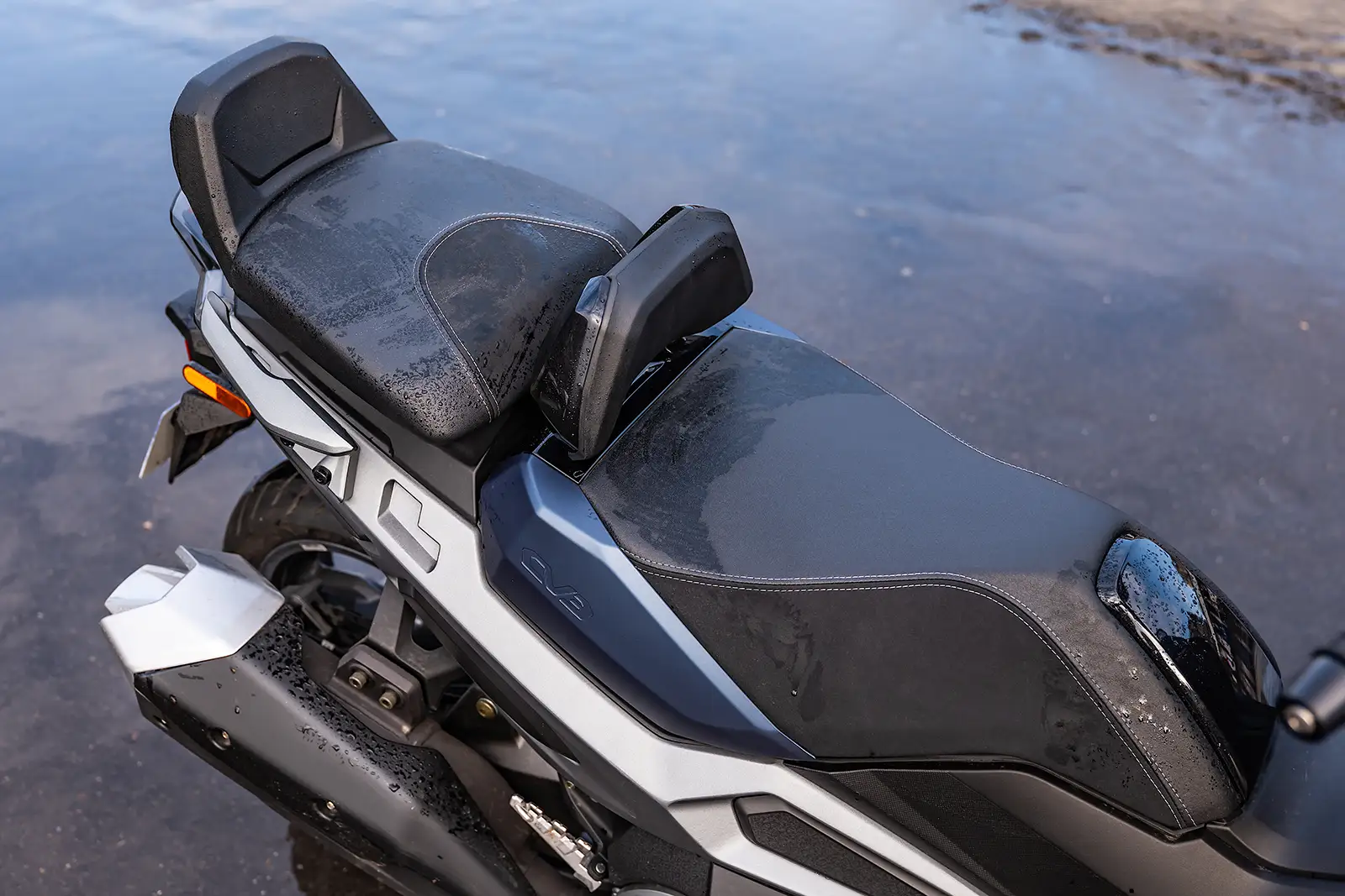 Le CV3 profite d’une selle plus restreinte mais très ergonomique tant pour le pilote que pour le passager. Dommage que l’entrejambe soit un peu trop large et qu’il soit impossible d’étendre les jambes. Plus lourd à manœuvrer, le Kymco surpasse son concurrent en mode attaque grâce à un châssis plus rigide, un train avant plus vif, une garde au sol basse et une très bonne stabilité. Le confort est ferme, le freinage est satisfaisant et les pneumatiques Maxxis font le job sur sol sec. Attention sur sol humide car aucun TCS (Traction Control System), ne vient compenser le couple de la machine.
