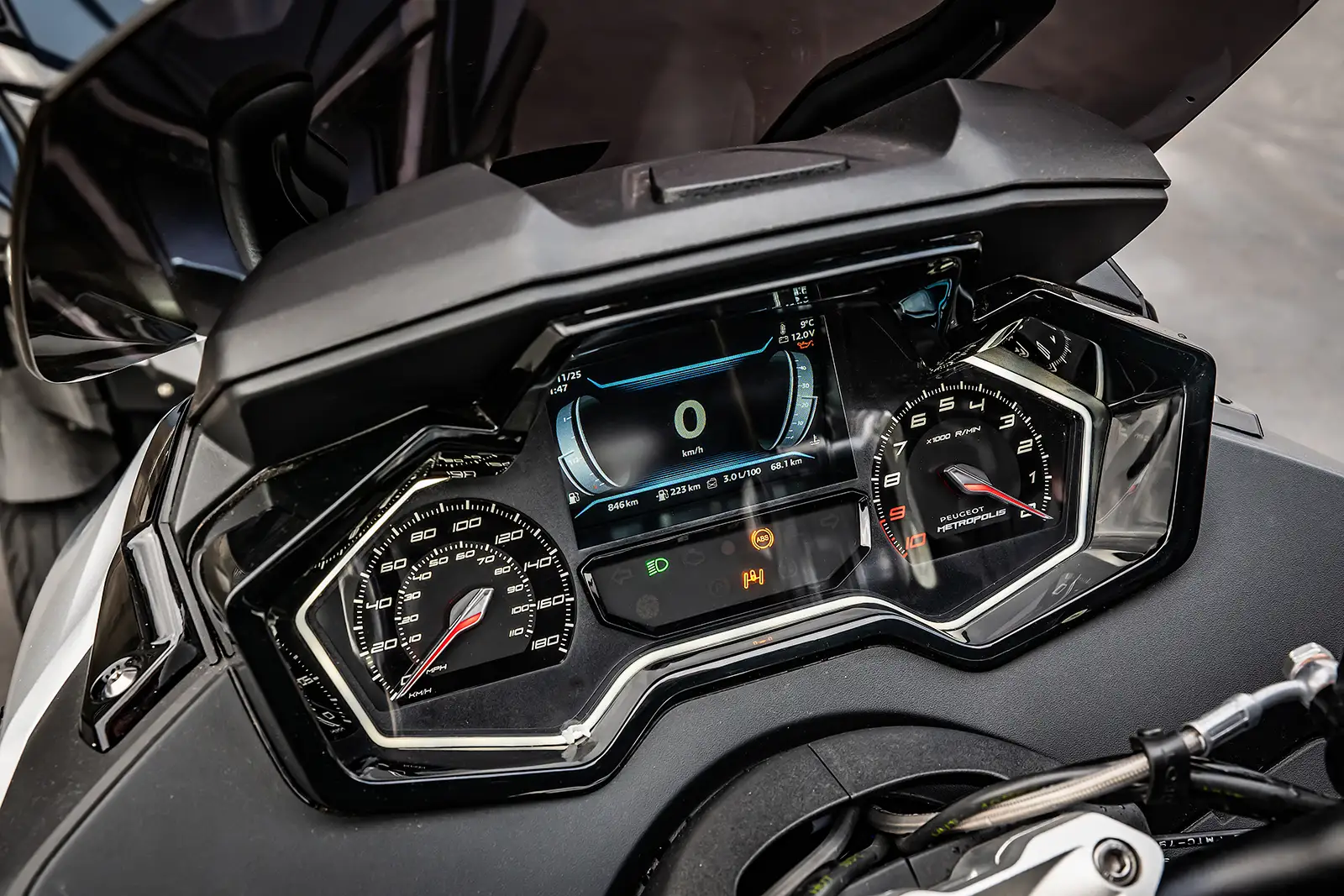 Le Peugeot Metropolis assume son héritage automobile avec un écran TFT de 5 pouces agrémenté de cadrans analogiques type Peugeot 308. Cet écran dispose du système i-Connect pour être alerté de ses messages, ses appels ou encore profiter de la navigation. Au quotidien, nous apprécions le frein de parking électrique, la prise USB dans le petit vide poche côté gauche, la smart key, la grande boîte à gants et les warnings. Ces derniers se déclenchent également automatiquement en cas de freinage d’urgence.