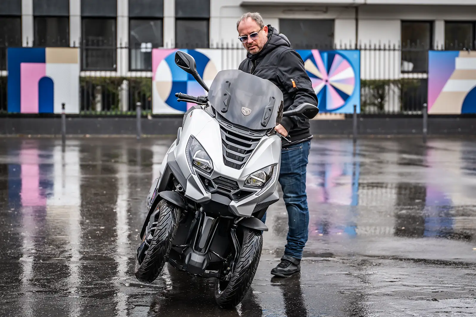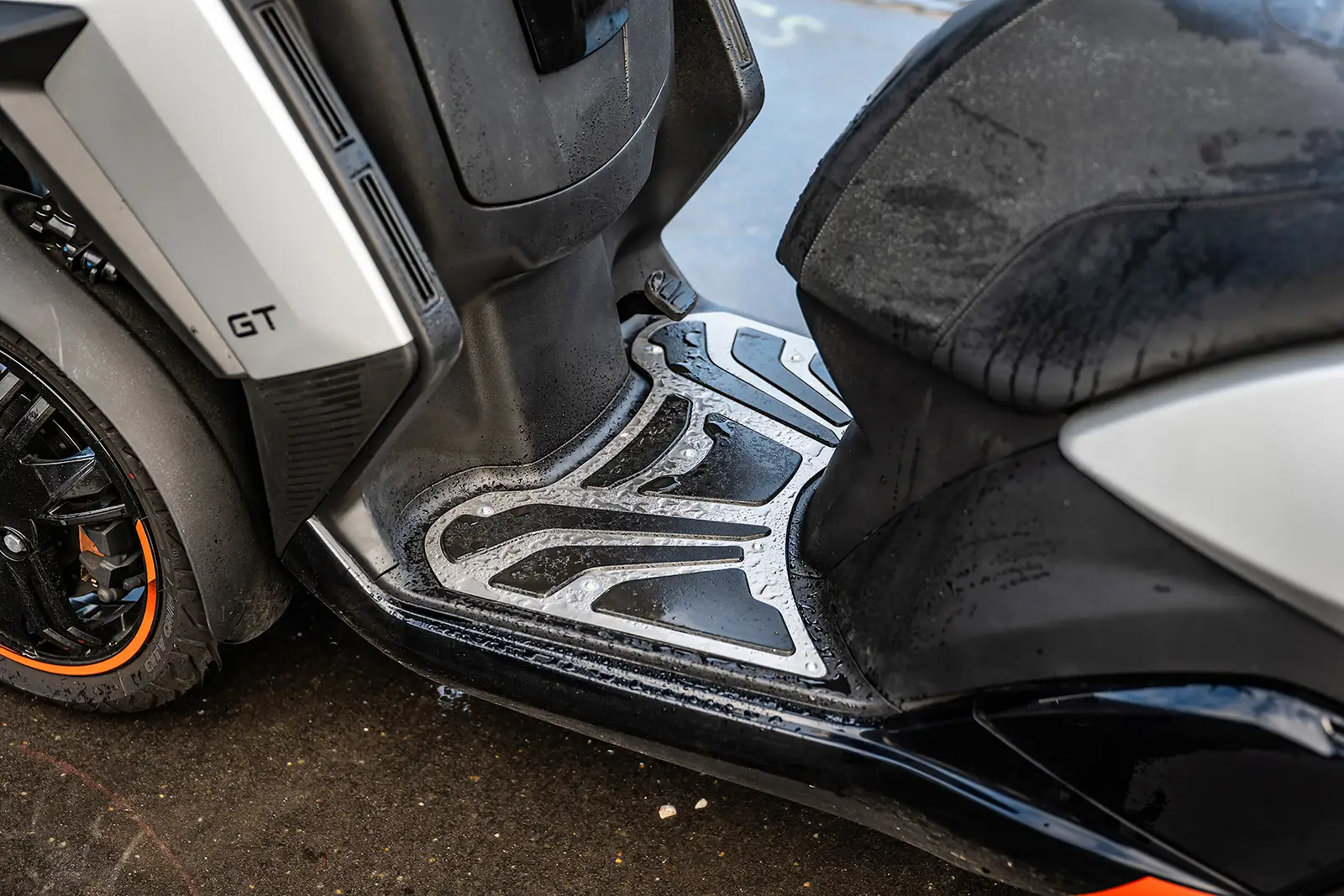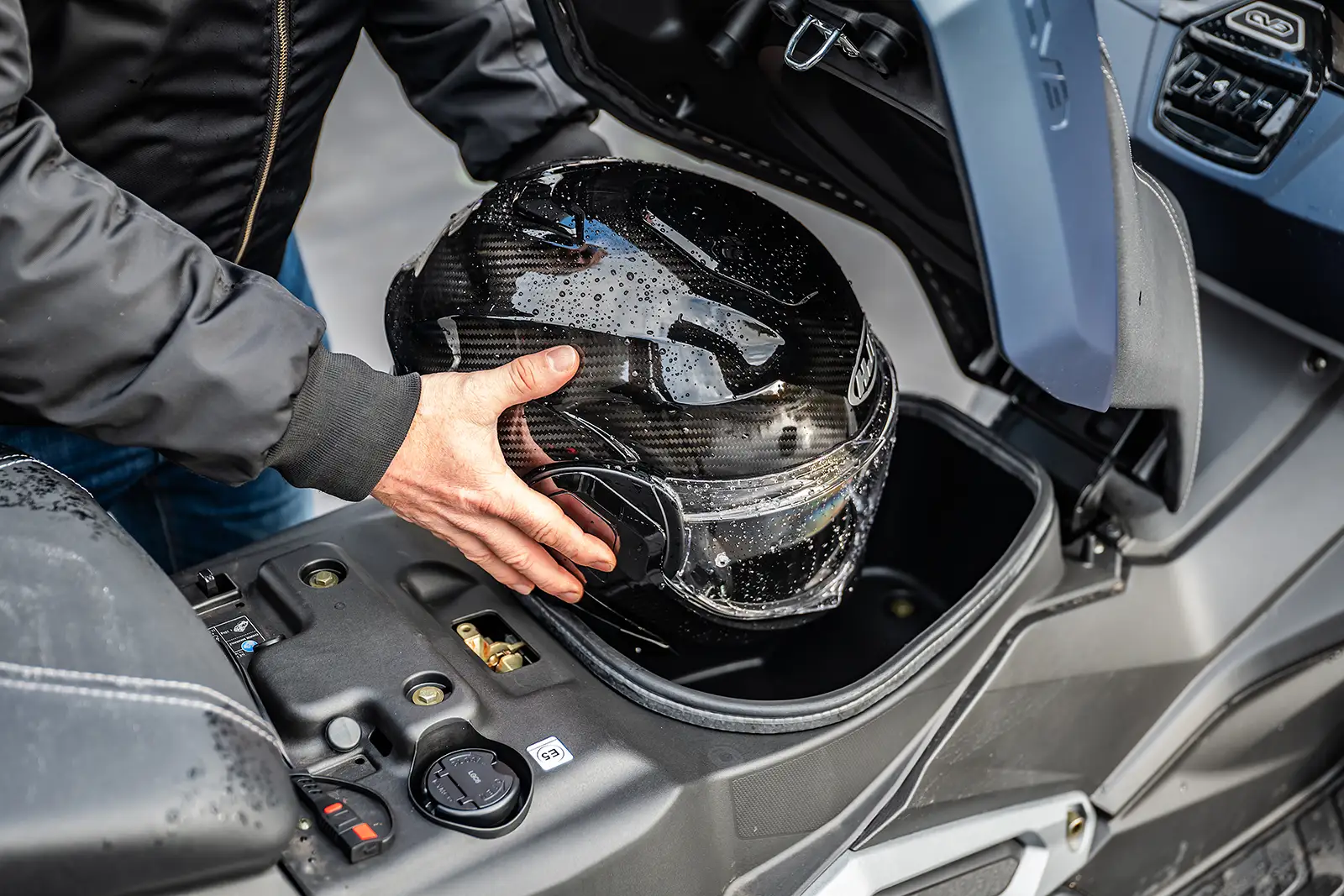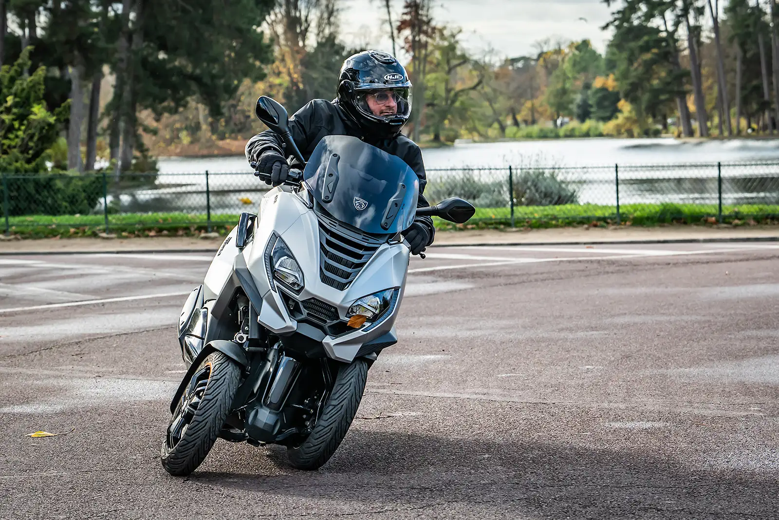 Le coffre accepte un petit casque, la bulle est réglable avec outils et le plancher plat est inexistant. En revanche, le dosseret réglable manuellement est très pratique et ergonomique. Enfin, grosse différence entre les deux modèles, avec un Metropolis disposant d’un roll-lock qui fige littéralement le train avant quand le CV3 nécessite de poser le pied au sol si vous dépassez le point d’équilibre.