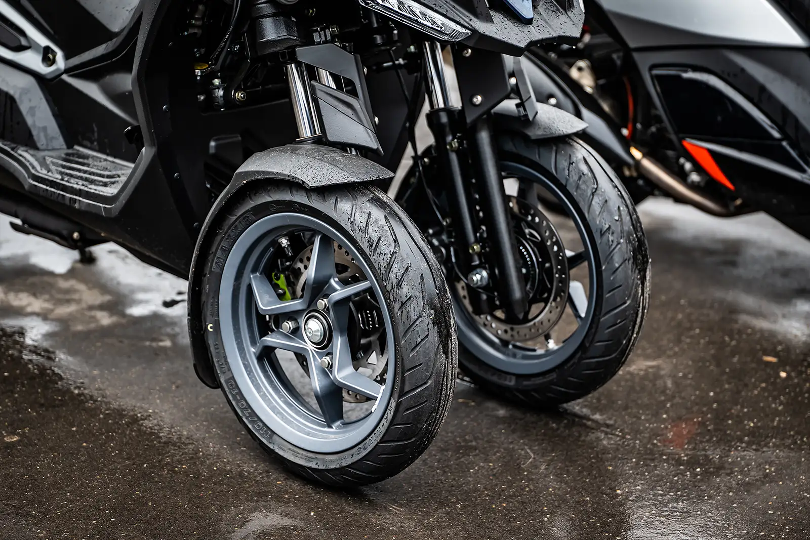 Le CV3 profite d’une selle plus restreinte mais très ergonomique tant pour le pilote que pour le passager. Dommage que l’entrejambe soit un peu trop large et qu’il soit impossible d’étendre les jambes. Plus lourd à manœuvrer, le Kymco surpasse son concurrent en mode attaque grâce à un châssis plus rigide, un train avant plus vif, une garde au sol basse et une très bonne stabilité. Le confort est ferme, le freinage est satisfaisant et les pneumatiques Maxxis font le job sur sol sec. Attention sur sol humide car aucun TCS (Traction Control System), ne vient compenser le couple de la machine.