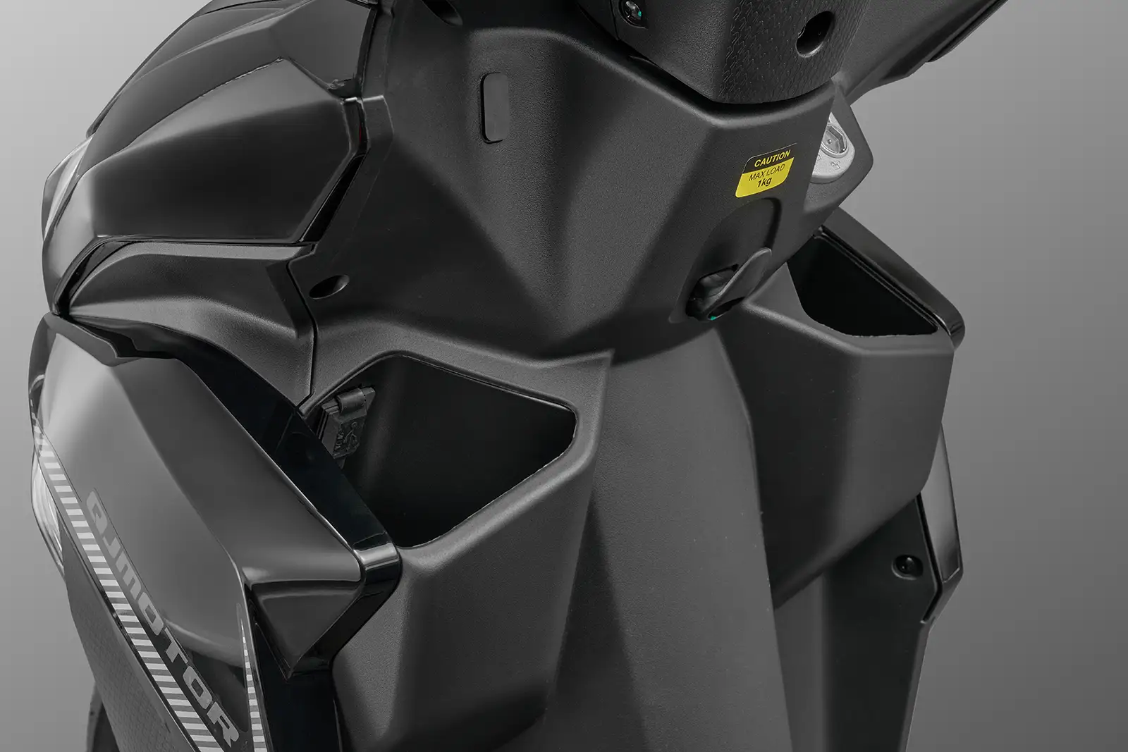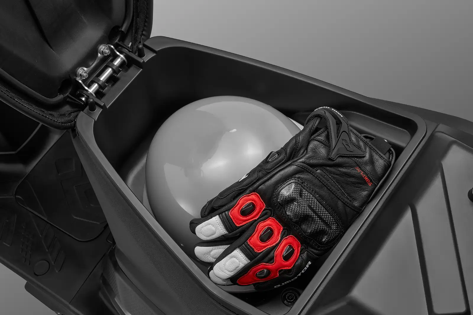 L’aspect pratique n’est pas en reste avec un coffre sous la selle, deux rangements ouverts dans le tablier et un crochet porte-sac, maximisant la capacité d’emport pour les courses ou les effets personnels.