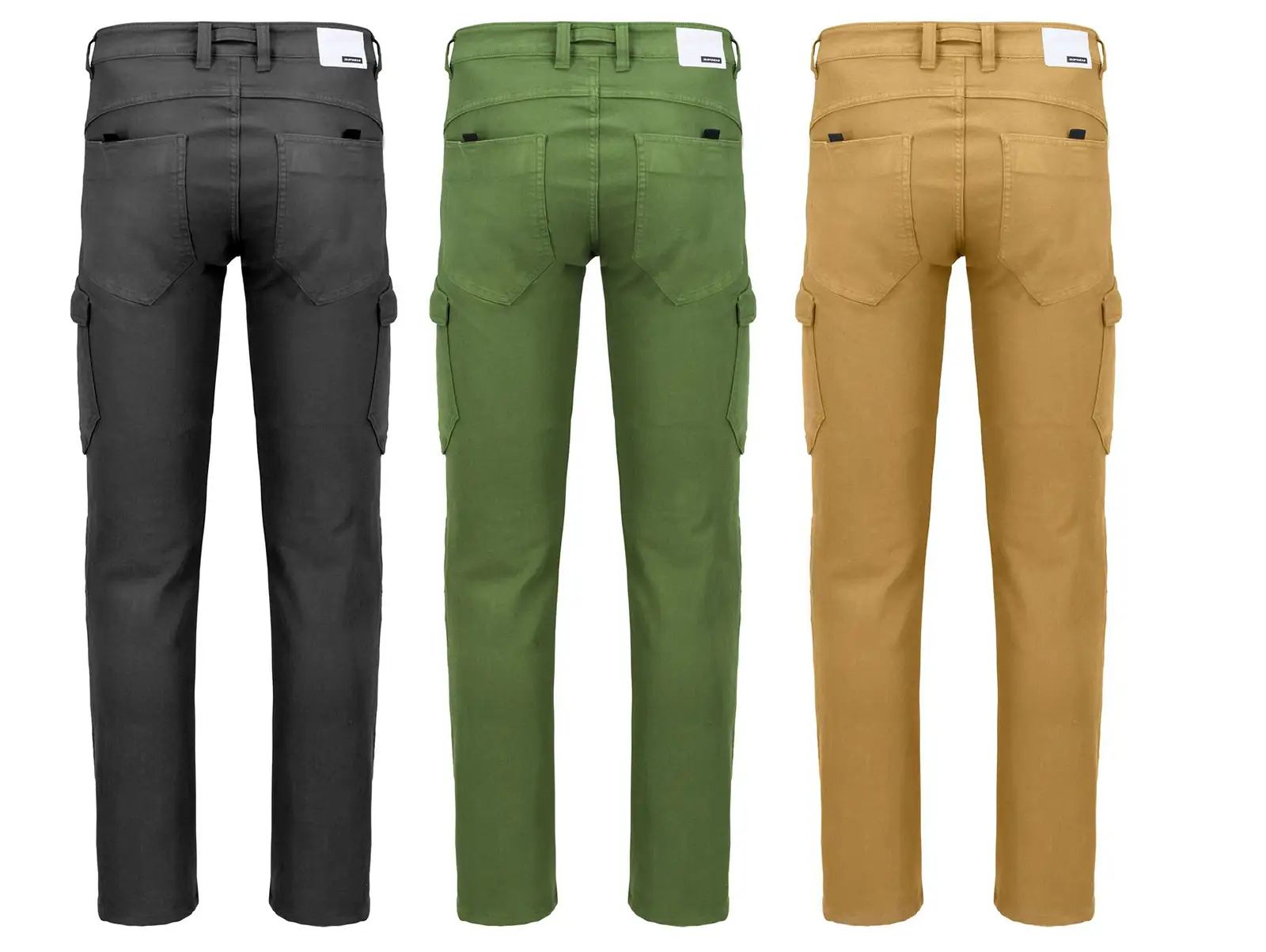Conçu en denim renforcé Cordura® 13 oz/m², il mise sur une coupe légèrement ajustée et un style marqué, notamment dans sa version kaki associée à un blouson en cuir patiné. Il s’adresse aux motards recherchant une alternative au denim traditionnel sans compromis sur la sécurité.